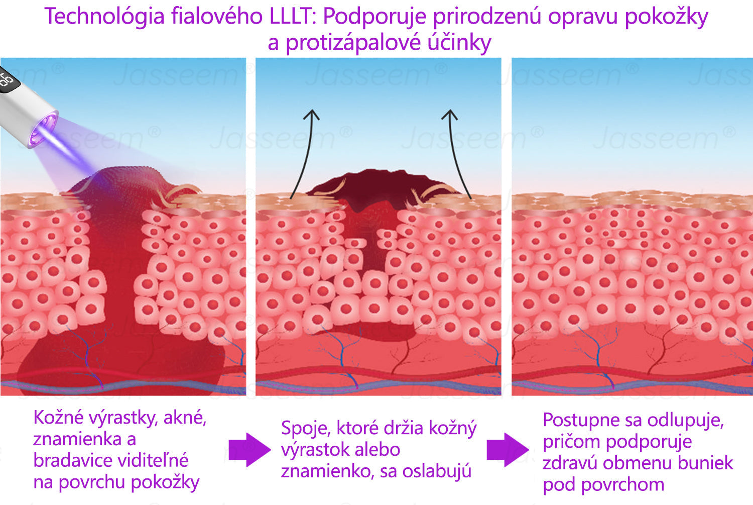 Pri ožarovaní pokožky pomocou zariadenia Jasseem® sa odporúča začať 3 cm od povrchu pokožky . Pri použití pocítite mierne teplo , ale žiadnu bolesť . Je to preto, že počas pôsobenia laseru naše fialové svetlo zároveň opravuje a chráni vašu pokožku .